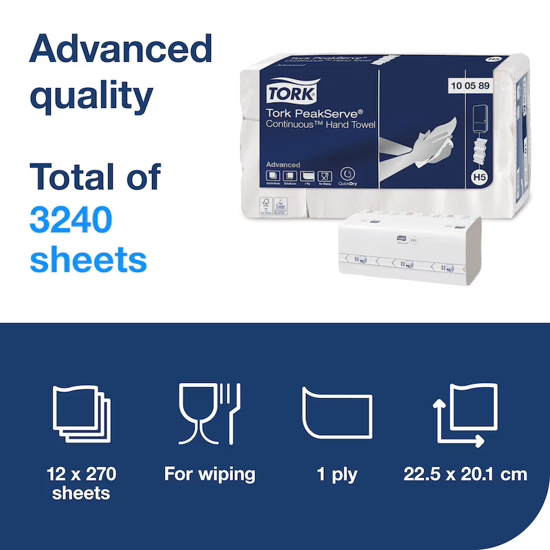Системата Tork PeakServe е с най-голям капацитет на пазара и използва 50% компресирани пачки с кърпи за ръце, които обслужват два пъти повече посетители. Това е особено важно по време на пиковите часове, когато кърпите често свършват.